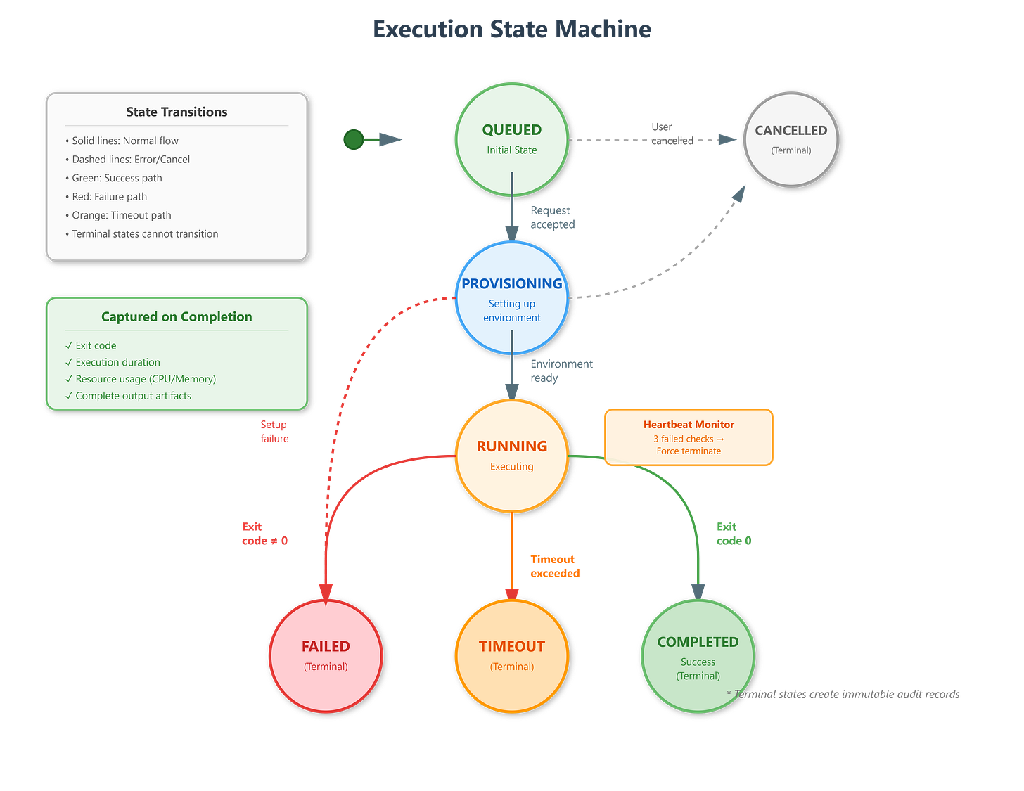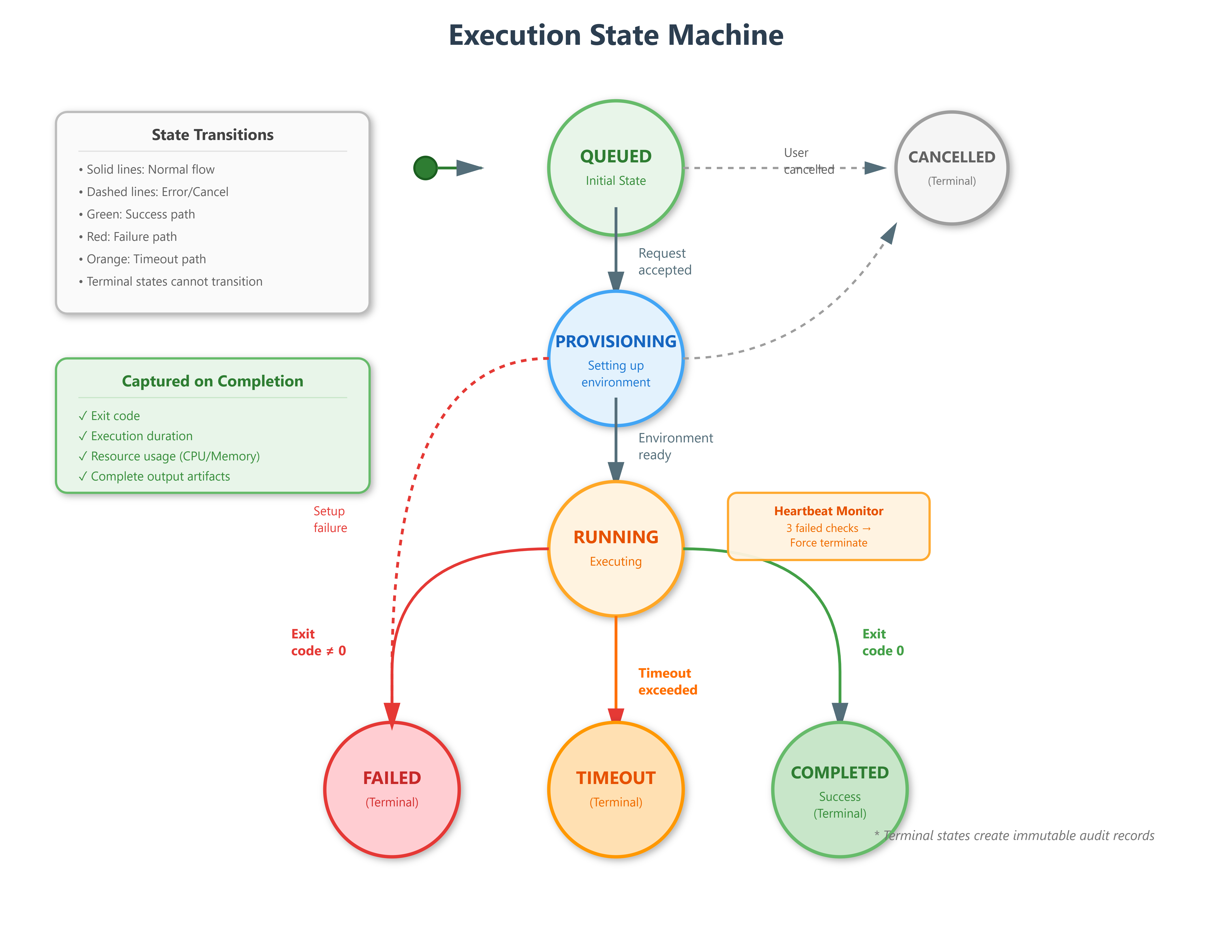 The PROVISIONING state handles environment setup failures gracefully, cleaning up partial resources and transitioning to FAILED with diagnostic information. This prevents resource leaks from container orchestration errors.