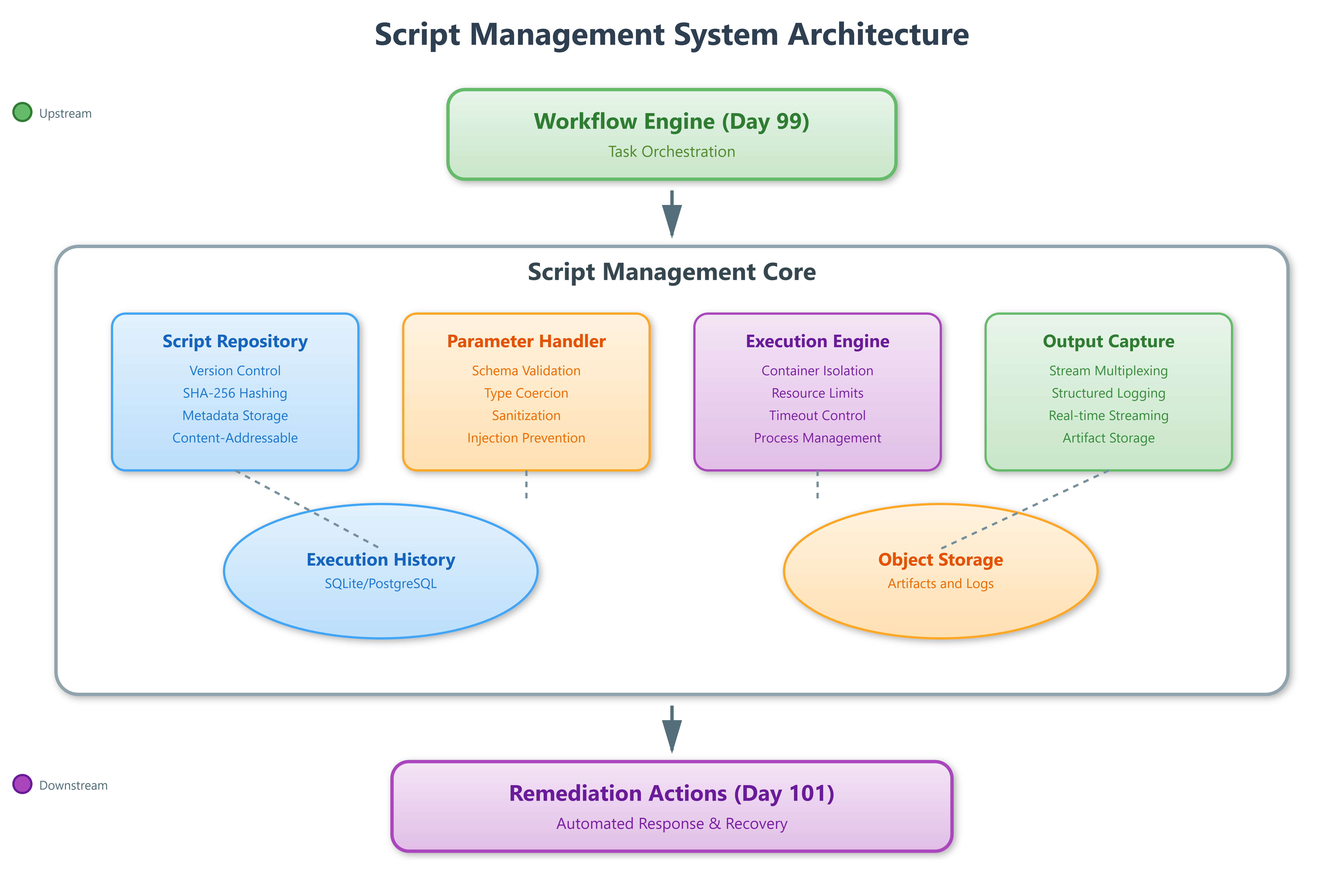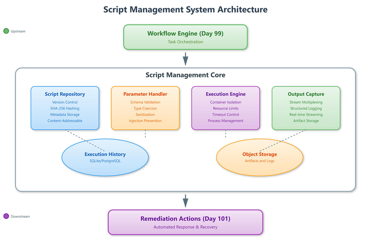Our Script Management system sits between the Workflow Engine (Day 99) and Remediation Actions (Day 101), transforming declarative workflow steps into concrete execution units. Think of it as the “kernel” of your automation platform—it handles the low-level concerns of execution safety, resource isolation, and output capture while exposing a clean API for higher-level orchestration.