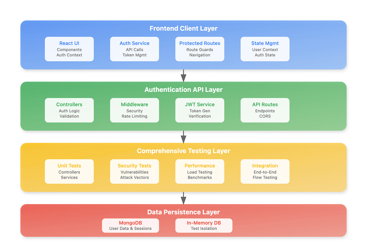 Multi-layered authentication testing framework with security, performance, and integration validation