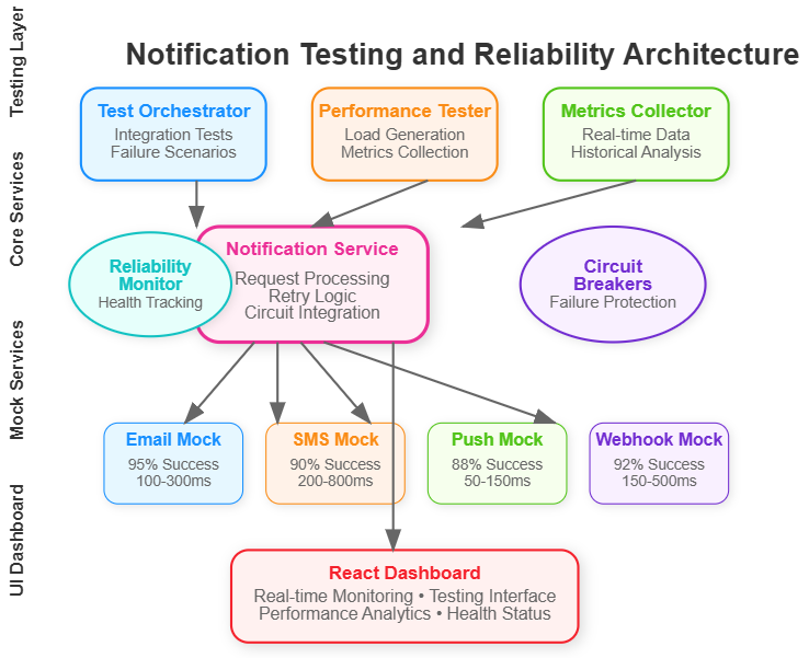 Consider GitHub’s approach: they test notification delivery across 15+ channels with mock services that simulate real-world failures. Their reliability monitoring catches issues before users notice them.