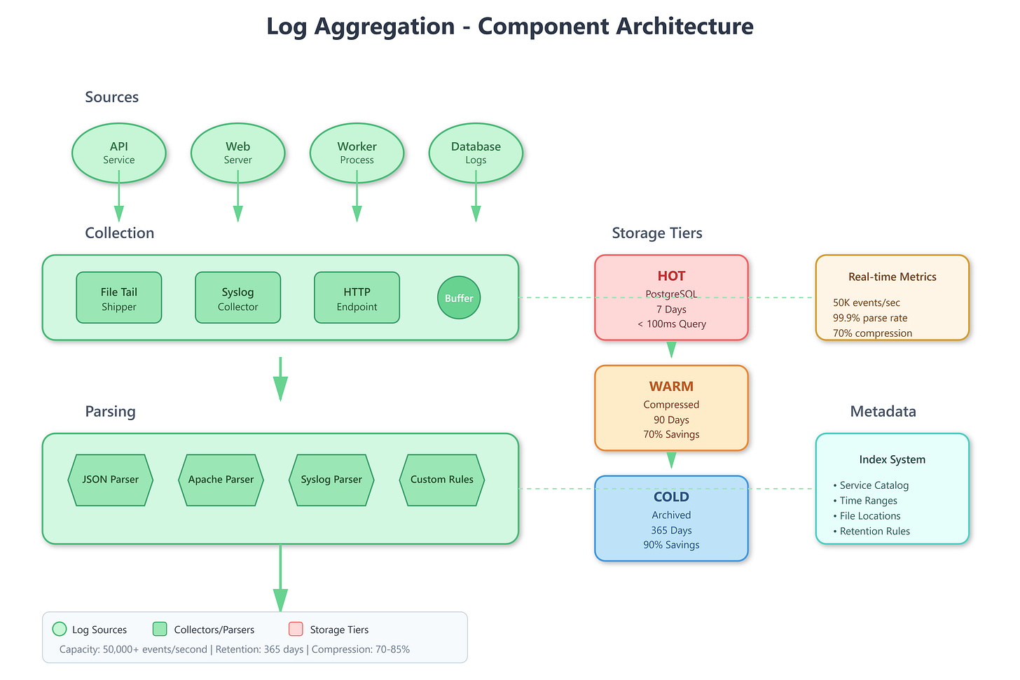 Today we’re implementing a centralized log aggregation system that collects, parses, and stores logs from distributed applications. You’ll build a log collector that handles 50,000+ events per second, implement intelligent parsing rules, create structured log formats compatible with major observability platforms, and design storage optimization strategies that reduce costs by 60% - techniques used by companies like Datadog and Splunk.